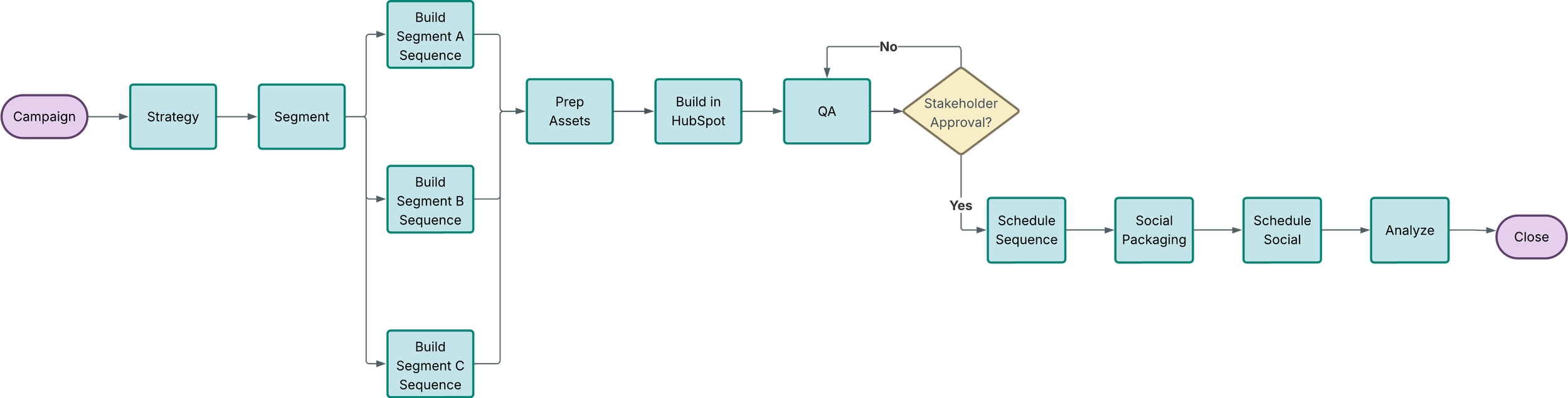 A sample campaign pipeline from strategy through results analysis. Messaging stays aligned across channels and performance insights can directly inform the next cycle.