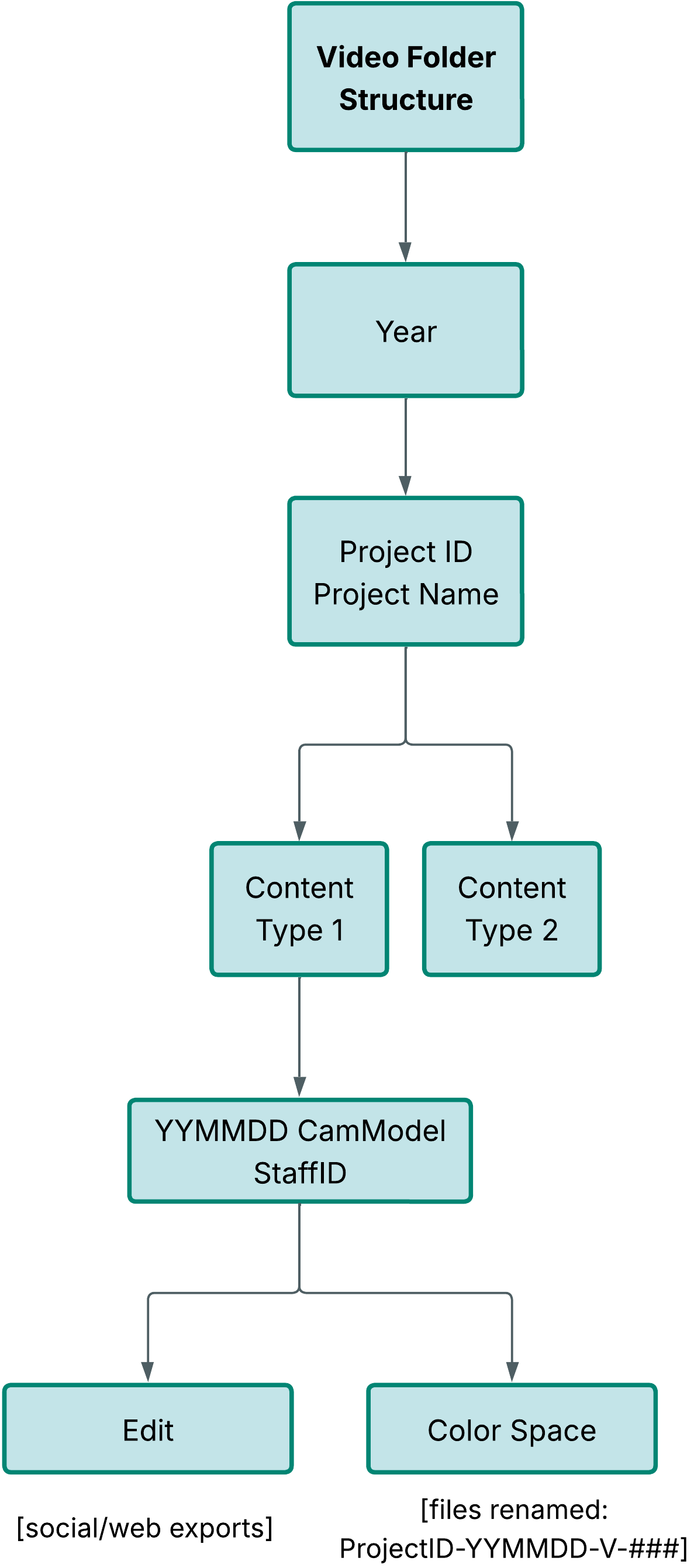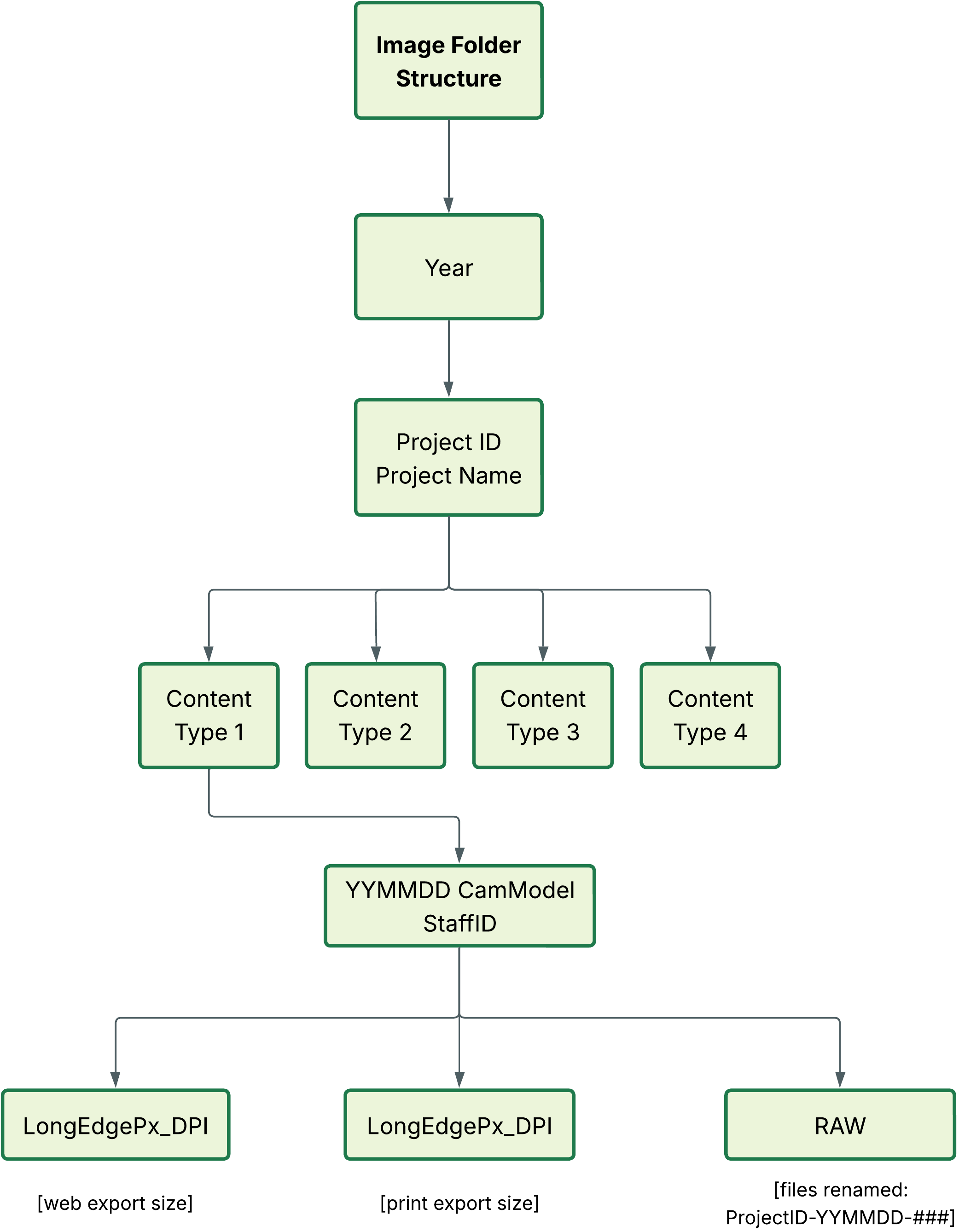 Each box in the diagram represents a folder level. All photos and videos are stored in a consistent folder structure with standardized naming, so assets stay traceable and easy to reuse.